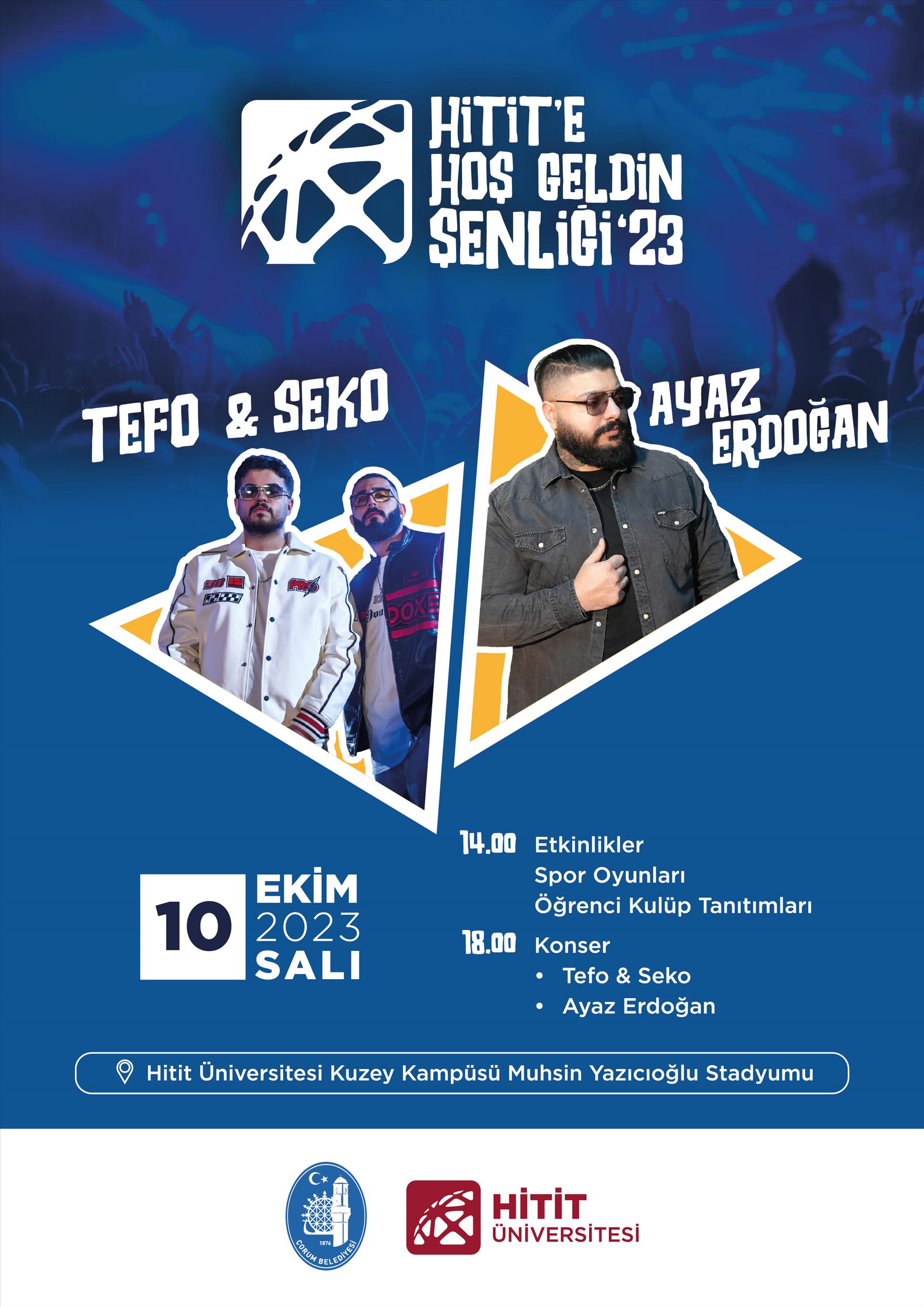 “10 Ekim 2023 Salı günü, Hitit Üniversitesi Kuzey Kampüsü Muhsin Yazıcıoğlu Stadyumu’nda, dopdolu etkinliklerle, yarışmalarla, gösterilerle ve konserlerle dolu unutulmaz bir gün için hazırlanan ‘Hitit’e Hoş Geldin Şenliği ’23’e hoş geldiniz! Bu muhteşem şenlikte, enerji dolu etkinlikler ve eğlenceli yarışmalarla keyifli vakit geçirecek, büyüleyici gösteriler ve harika konserlerle müziğin ritmine kapılacaksınız.”